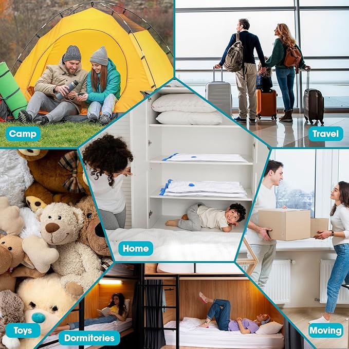 - Hand Pump: The hand pump of the storage bags vacuum sealed reduces the noise, can be reused after opening the bag or the air is let in. The hand pump removes air, maximize storage efficiency! Hand pumps are lightweight and suitable for travel, dorm rooms, camping. Vacuum bags for clothes could works with standard vacuum cleaner, essential for those looking to optimize packing and storage strategies