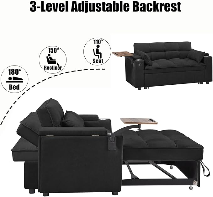 - Versatile Convertible Loveseat Sleeper: This stylish loveseat sleeper features armrests with hidden storage, built-in USB and Type-C ports, cup holders, and a 360° swivel side table—ideal for snacks, laptops, or reading materials. Perfect for living rooms, home offices, or dorm rooms.