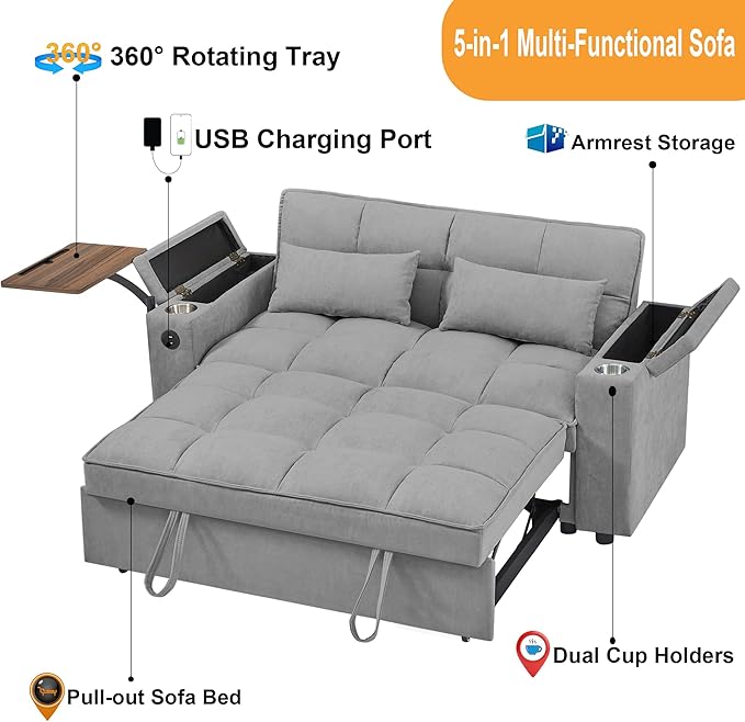 - 【3 in 1 Functional Armrest】 The innovative sofa sleeper features two built-in charging ports (2 USB-A, 1 Type-C), allowing you to conveniently charge your electronic devices.The cup holders, enjoy leisure life at your fingertips. Hidden storage space under armrest, perfect for remote controls or books