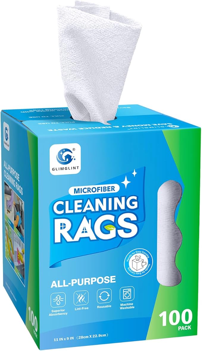 GLIMGLINT Microfiber Cleaning Cloth, 100 Pack Shop Towels, Lint-Free, Ultra Absorbent Reusable or Disposable Microfiber Cloths for Kitchen, Car, Cleaning Rags, 11" x 9", White