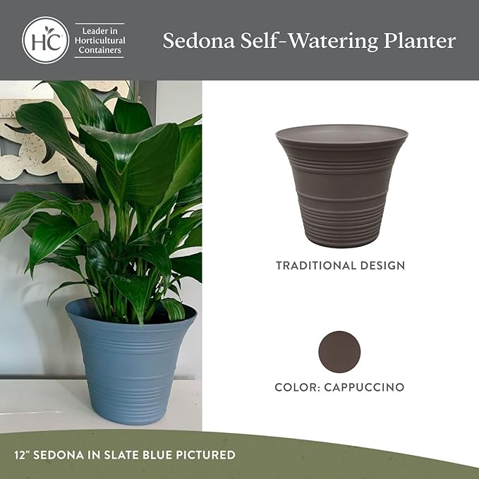 The HC Companies 12 Inch Sedona Round Self Watering Planter Pots, Lightweight UV-Resistant Plastic Outdoor Planters, 2-Pack Flower Pots for Garden & Home Decor, Cappuccino