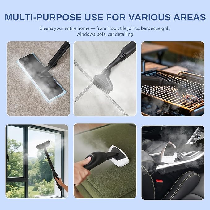 - WIDE APPLICATION FOR ALL CLEANING SCENARIOS: Designed for home use, this steam cleaner for home is ideal for kitchens, bathrooms, floors, carpets, cars, sofas, mattresses, toilets, windows, curtains, walls, ovens, and even clothing. The flexible hose and long power cord provide excellent maneuverability, making this steam cleaners and floor steam cleaner combo your go-to tool for tackling everyday messes or deep-cleaning projects.