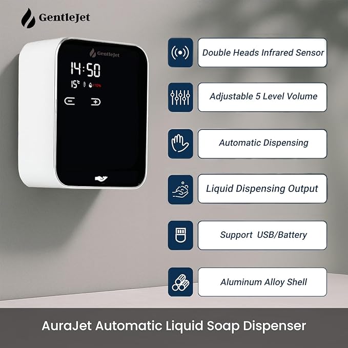 AuraJet Automatic Liquid Soap Dispenser Touchless - Adjustable Levels, Digital Display, Aluminum Alloy Body, Battery Operated or USB-Powered Automatic Hand Soap Dispenser Wall Mount