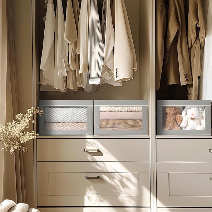 - [Practical Design] The front of the large storage boxes has been chosen to be transparent, making it easy to identify the contents of the foldable organizer at a glance. When you are storing out-of-season clothes, the storage bins lid can keep the out-of-season clothes clean all the time