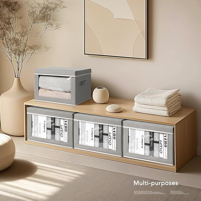 Large Storage Baskets with Lids - Stackable Cube Bins for Closet, 6 Pack Grey Windows Organizer Bins, Home Organizers and Storage for Clothes, CD, Towels