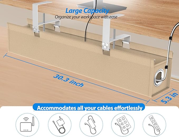 - Large Capacity with Built In Ties: Measuring 30.3"×5.3"×5.9", this under desk cable tray hides adapters and sockets while built in ties secure each cord, giving you a clutter free workspace and an always neat organized setup