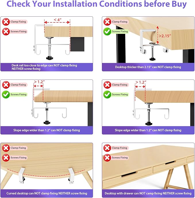 - Two Ways Installations. This under desk organizer supports both no drill clamp on and screw fixing installation, it fits all table top materials such as wood table, glass table, and metal table.