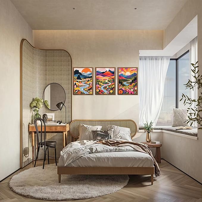 - ✨ 【Set of 3 Framed Wall Art】 Includes three framed canvas prints featuring colorful mountains, rivers, sunsets, and flowers, adding vibrant natural beauty to your home.