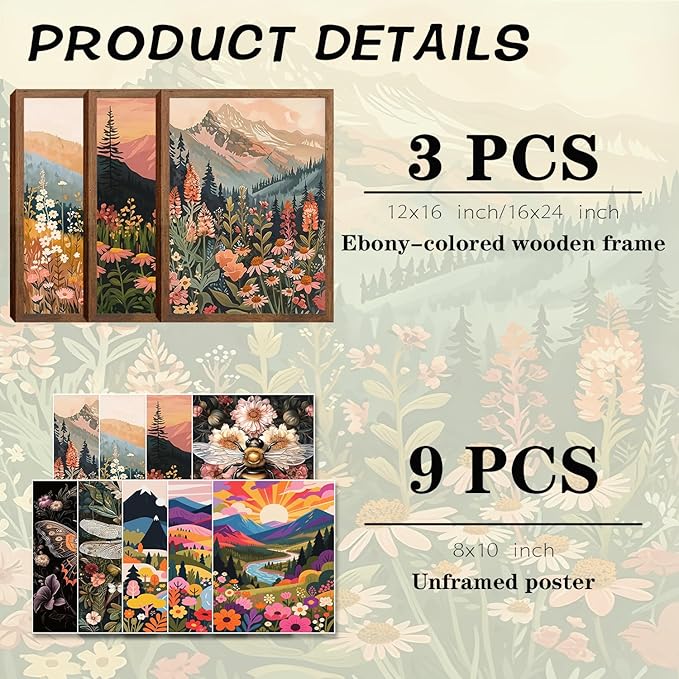 Colorful Nature Floral Wall Art Set of 3 12x16in Wood Framed, with 9 Bonus 8x10in Poster Art Prints, Boho Retro Wildflower Landscape Artwork Wall Decor for Living Room Bedroom Home Decor