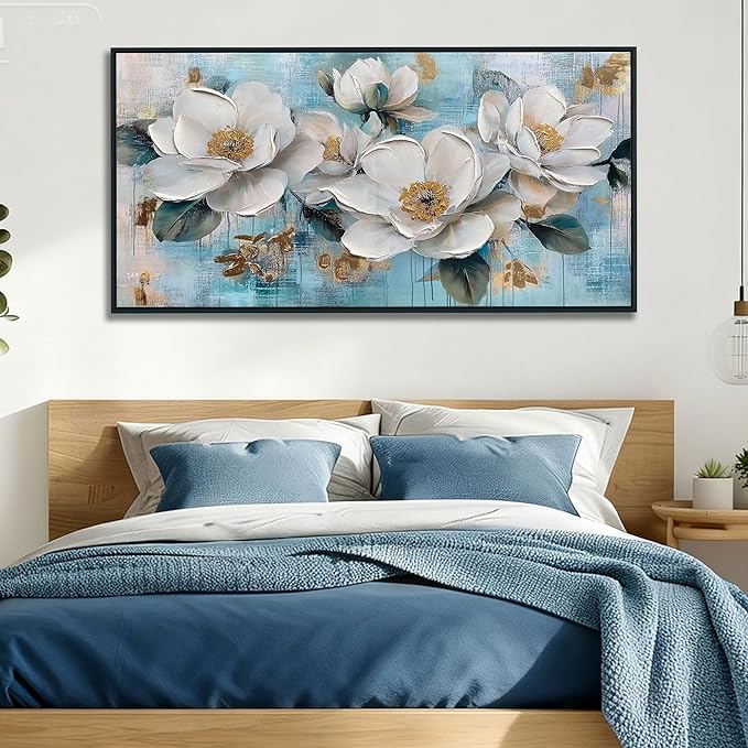 Ardemy White Floral Wall Art, Framed Teal Canvas Wall Art For Living Room Large Magnolia Pictures Wall Decor Flower Paintings Artwork for Walls Dining Room Bedroom Home Office 40"x20"
