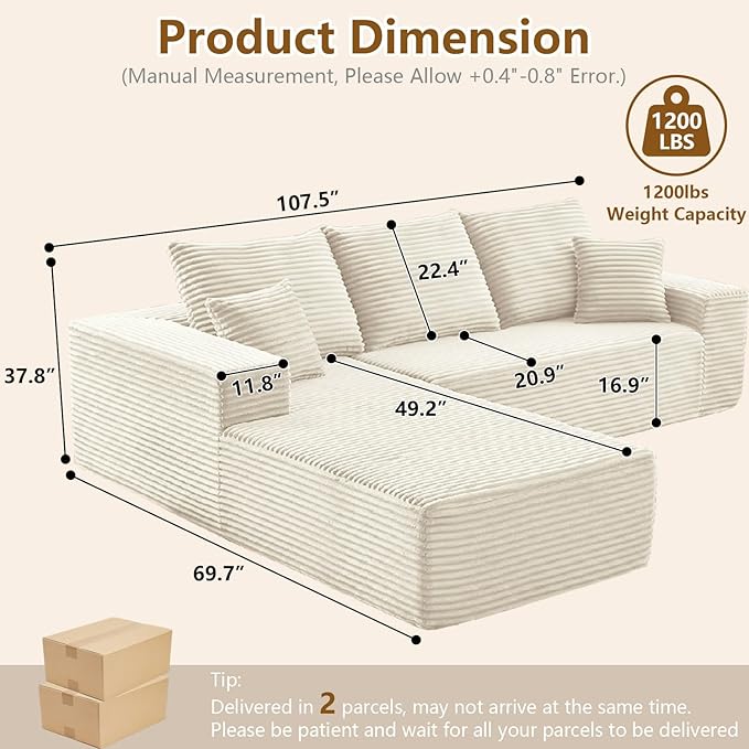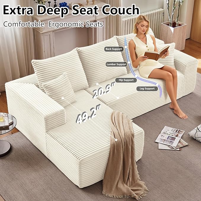 107" Cloud Sectional Couch with L-Shape Chaise, Modern Modular Comfy Sofa with Deep Seat, Upholstered Corduroy Couches Sleeper Chaise Longue for Living Room Bedroom, No Assembly Required, White