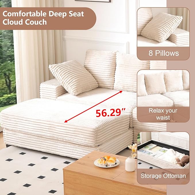 108" Oversized Sectional Sofa Modular Deep Seat Sofa Couch with Storage Ottoman, Modern Comfy Upholstered Cloud Couches, L-Shaped Corduroy Sofa Chaise with 8 Pillows for Living Room, Light Beige