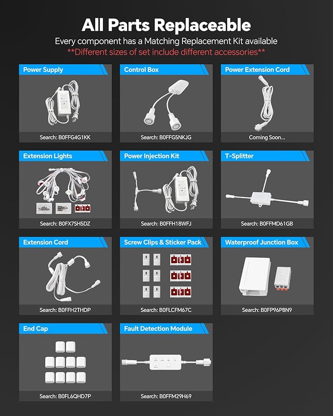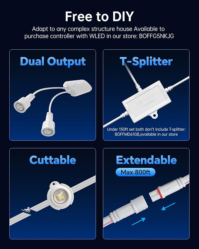 - 【Cuttable & Splicable】ASAHOM permanent outdoor lights provide flexible cuttable DIY experience. Use included waterproof junction box and wire connector to splice the lights. When the outlet is in the middle of house, use attached T-splitter to help run two light string in opposite directions from the same controller. Extend to MAX.800FT.(Control box with WLED is available to buy in our store: B0FFG5NKJG)