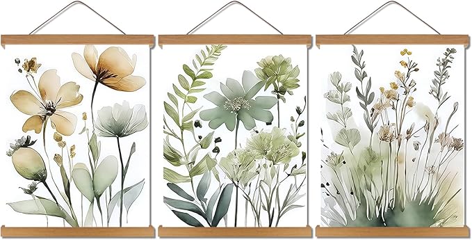 Hanging Botanical flowers Wall Art Set of 3, Watercolor Sage Botanical Plant Floral Canvas Prints Wall Decor, Boho Minimalist Poster Print Artwork for Living Room Bedroom Bathroom Home Decor 12x16In