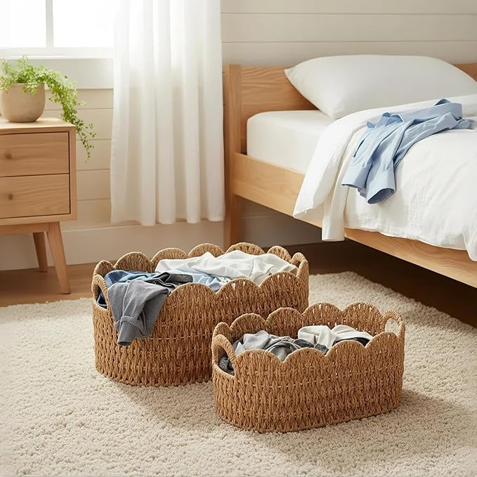 - Charming Scalloped Design:Elevate your home's aesthetic with our uniquely cute scalloped basket design. Inspired by seashells, the elegant wavy edges add a touch of whimsical decor to any space. The natural texture of this woven basket blends rustic farmhouse charm with modern boho chic, making it more than just a storage bin—it's a beautiful accent piece. It’s the perfect baskets for gifts empty, ready to be filled with your personal style