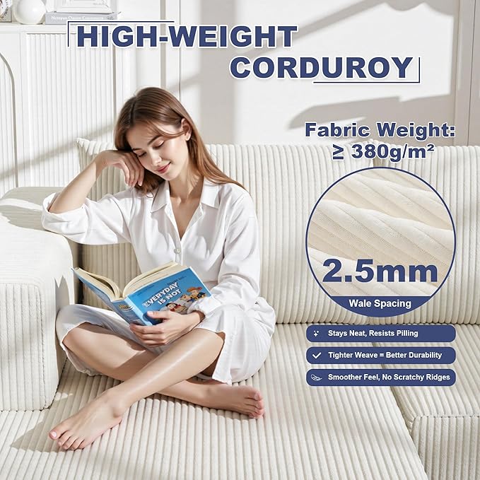 - Premium Corduroy:Wrapped in 380g/m² fine-rib 2.5mm corduroy, the fabric feels soft, matte, and incredibly dense. It resists fading, pilling, and rough textures, making it ideal for families, pets, and stylish interiors.