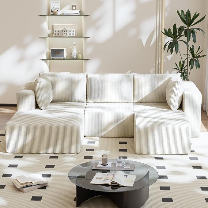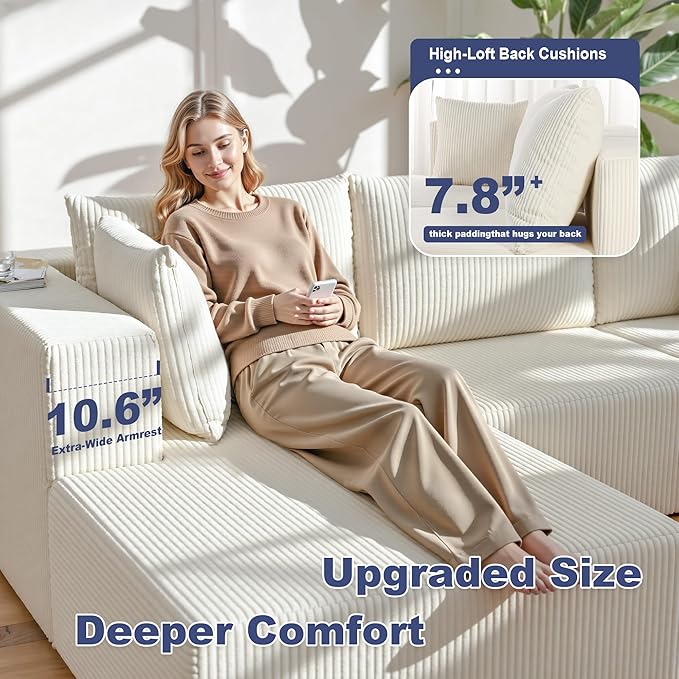 108" Boneless Couches for Living Room, Modular Cloud Couch Sofa - 4 Pieces U Shap Corduroy Sectional Sofa, Fluffy Memory Foam Sleeper Sofa Furniture, No Assembly, Wide Armrest, Beige