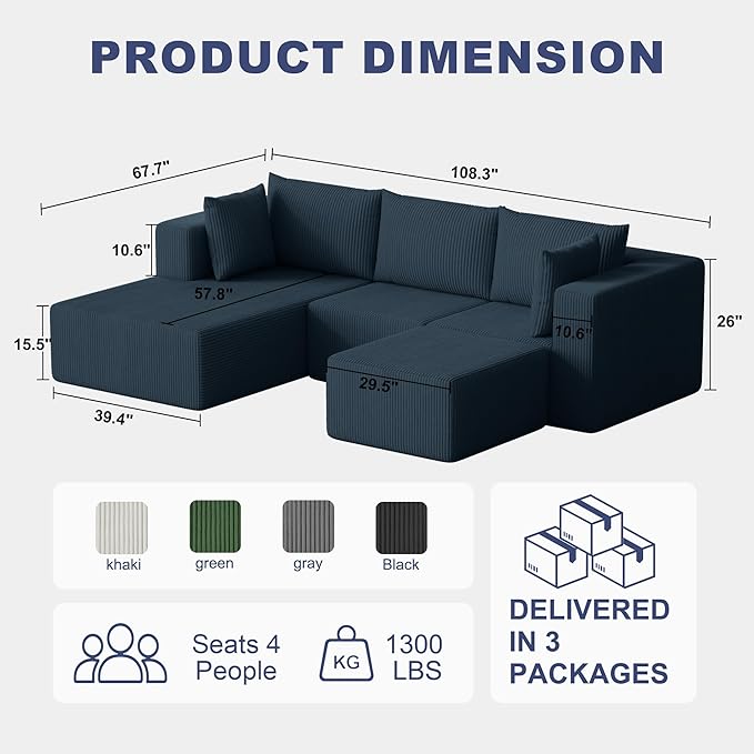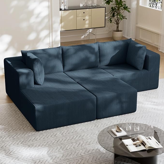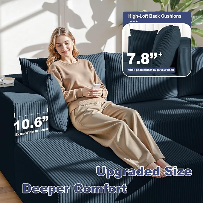 108" Boneless Couches for Living Room, Modular Cloud Couch Sofa - 4 Pieces U Shap Corduroy Sectional Sofa, Fluffy Memory Foam Sleeper Sofa Furniture, No Assembly, Wide Armrest, Navy Blue