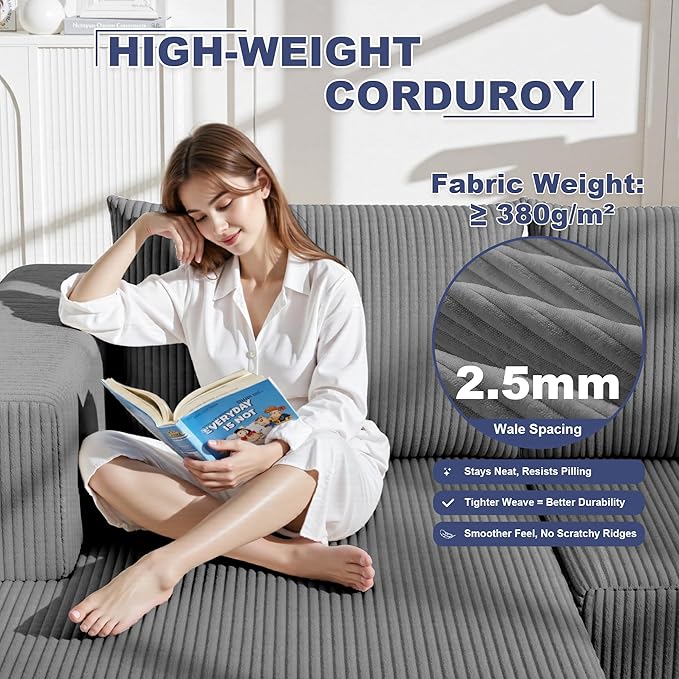 - Premium Corduroy:Wrapped in 380g/m² fine-rib 2.5mm corduroy, the fabric feels soft, matte, and incredibly dense. It resists fading, pilling, and rough textures, making it ideal for families, pets, and stylish interiors.