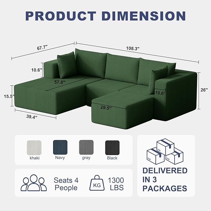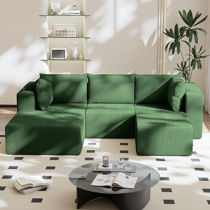 108" Boneless Couches for Living Room, Modular Cloud Couch Sofa - 4 Pieces U Shap Corduroy Sectional Sofa, Fluffy Memory Foam Sleeper Sofa Furniture, No Assembly, Wide Armrest, Green