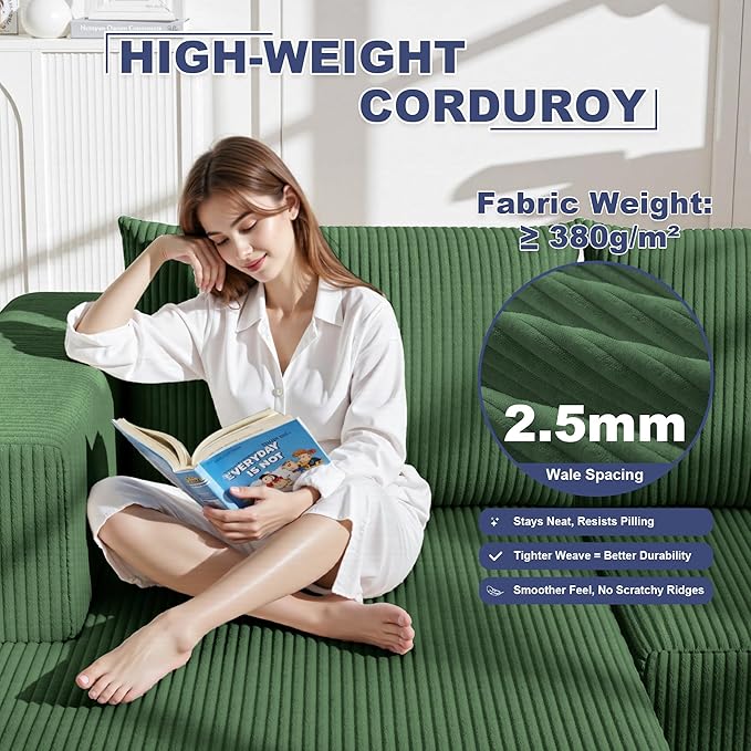 - Premium Corduroy:Wrapped in 380g/m² fine-rib 2.5mm corduroy, the fabric feels soft, matte, and incredibly dense. It resists fading, pilling, and rough textures, making it ideal for families, pets, and stylish interiors.