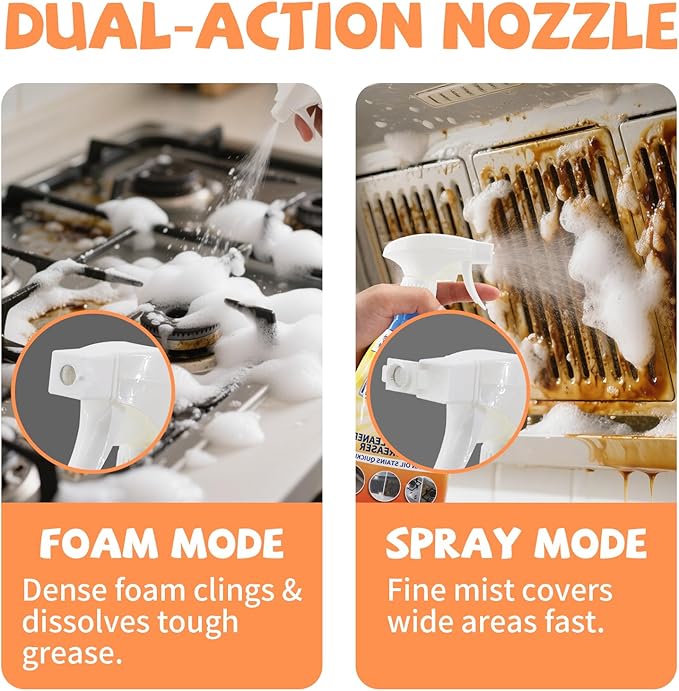 - 2-in-1 Dual Nozzle - The dual nozzle design can switch between fine spray and foam flow, allowing you to easily tackle light and heavy cleaning needs in different home scenarios: use the fine spray for quick tasks like dusting appliance exteriors or wiping up countertop spills, and flip to the foam mode for tough jobs such as cutting through cooktop grease, degreasing range hoods, or deep-cleaning shower tile.