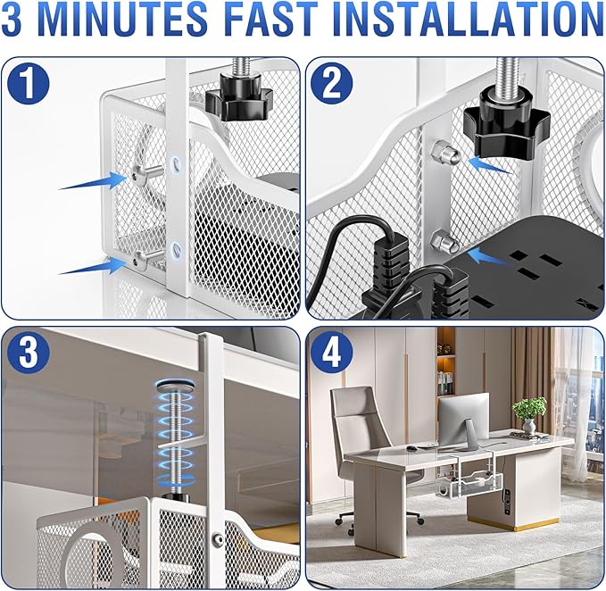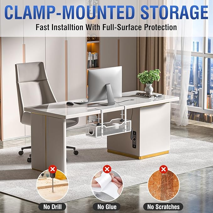- 【No Drill Required】 Our cable management tray installs in three minutes or less using a simple clamp-on system. Anti-slip rubber pads protect your desk from scratches and damage. No drilling, adhesives, or permanent alterations are needed—making it safe for both home and office use.