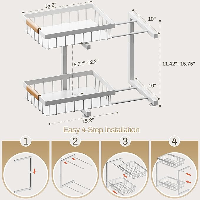 - 【Dimensions】15.2"L x 10"W x 11.42'' - 15.75''H. To fit most of the under-sink room, the total height of this Under Sink Organizer can be adjusted from 11.42 inches to 15.75 inches. Please measure your under-sink room before purchase to avoid unnecessary return.