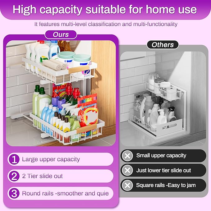 - 【2 Sliding Drawer】The 2 baskets are designed as sliding drawers with handle, allowing you to easily access the items stored at the corner.