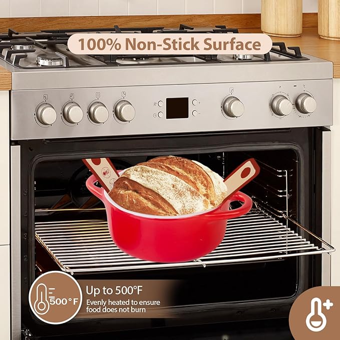 - [RED SAFETY HANDLE] - The signature extra-long red handle is designed for safe handling. Available in both round and oval sizes to accommodate various baking needs and different pot shapes. Safely place dough into a scorching oven and retrieve freshly baked bread without any risk of burns. The vibrant red color ensures this baking tool is easily spotted in your kitchen drawer.