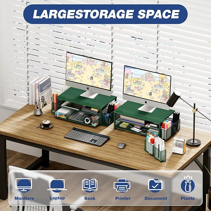 - 【Save Space】:This 2-Tier monitor stand with drawer and 2 hanging pen holders provides ample storage space to keep your office supplies and office desk accessories neatly organized and easily accessible, keeping your workspace tidy and improving your sense of well-being