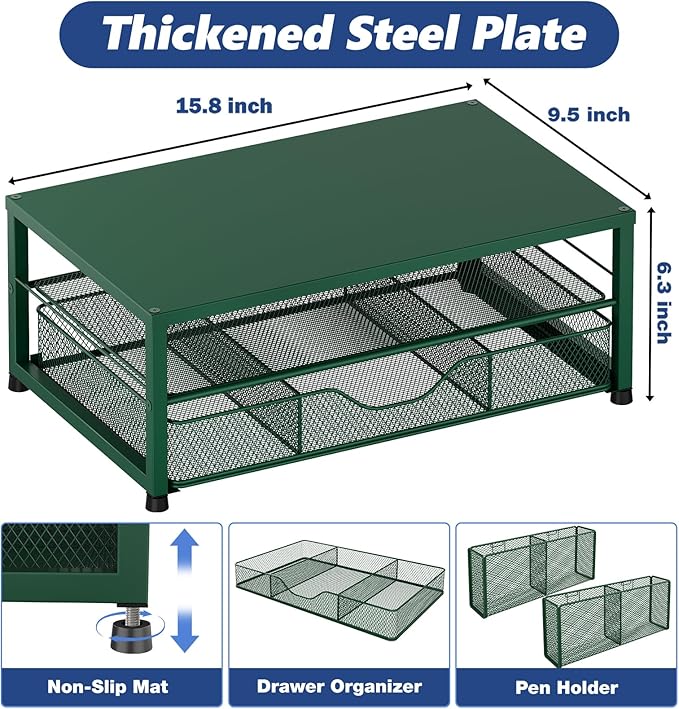 Desk Organizers and Accessories, 2-Tier Computer Monitor Stand Riser with Drawer and 2 Pen Holders, Laptop Stand, Office Desk Accessories for Office Supplies, Dark Green