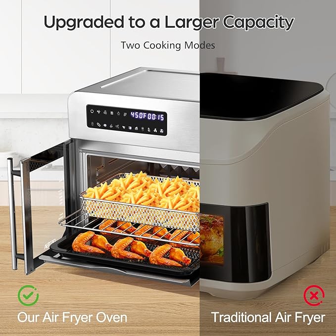 - 【Fulfill Family Needs】The air fryer toaster oven boasts an 24QT extra-large capacity, effortlessly cooking meals for 4 to 6 people in a single batch. Easily fit a 4-pound chicken or a 12 inch pizza inside, and remove the divider for even more cooking space.Equipped with 7 accessories to meet diverse cooking needs.