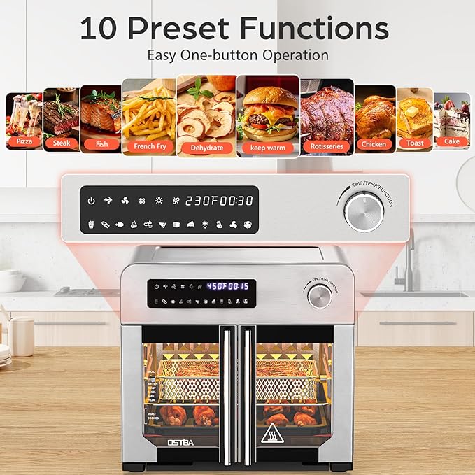 - 【Easy One-button Operation】This french door air fryer oven combo features 10-in-1 Functionality, featuring 8 food presets + Warm + Dehydrate function. Whether you're frying up after-school snacks in your air fryer or baking food for a big gathering, our toaster ovens countertop makes cooking a breeze.