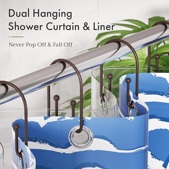 - Unique design: These shower curtain hooks feature a unique double hook design, allowing you to hang both the curtain and liner simultaneously. The inward bending hooks provide extra security, preventing the curtain from sliding off