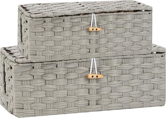 Temary Cable Management Box with Lids, 2-Pack Handmade Cable Organizer Boxes for Home, Office to Hide Cords and Power Strip, Cord Cover Floor Hider Set Woven Rattan Cable Organizer Box (Grey)