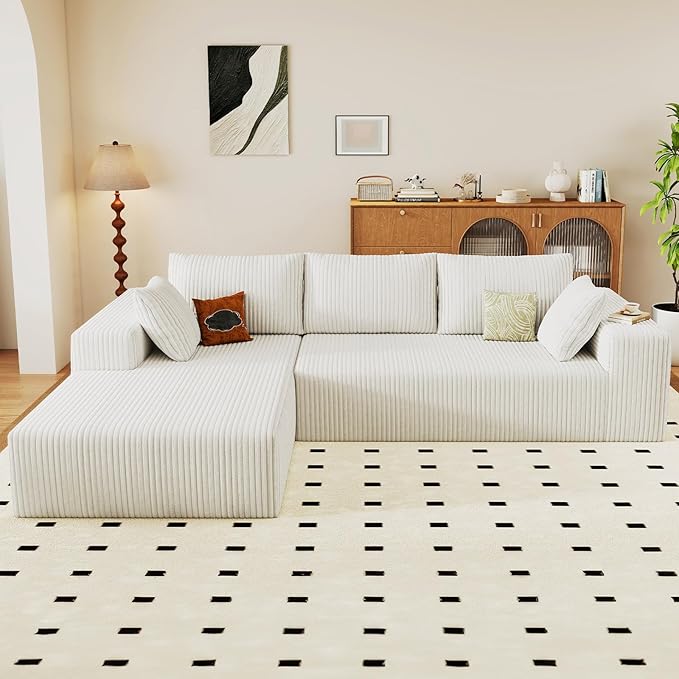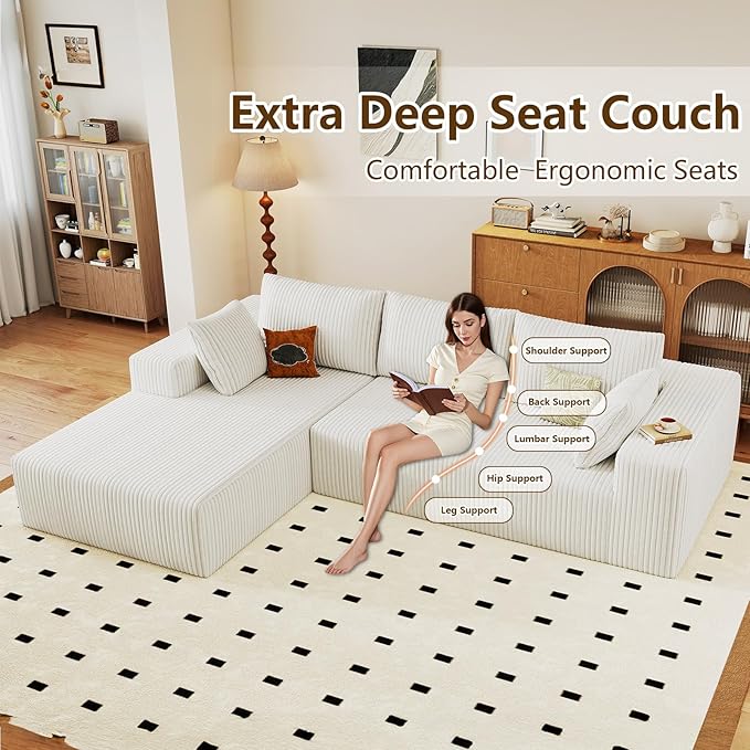 96" Modular Sectional Couch, Boneless L Shaped Cloud Sofa with Chaise Lounge, Corduroy Upholstered Couches Memory Foam Deep Seat, No Assembly Required, Ideal for Living Room(White, Left Facing)