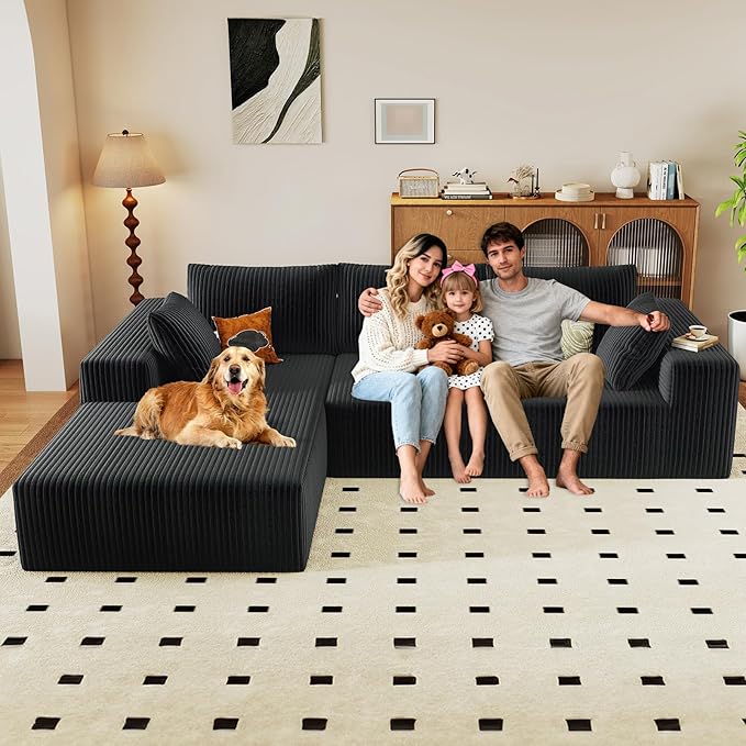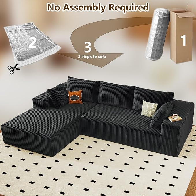 96" Modular Sectional Couch, Boneless L Shaped Cloud Sofa with Chaise Lounge, Corduroy Upholstered Couches Memory Foam Deep Seat, No Assembly Required, Ideal for Living Room(Black, Left Facing)