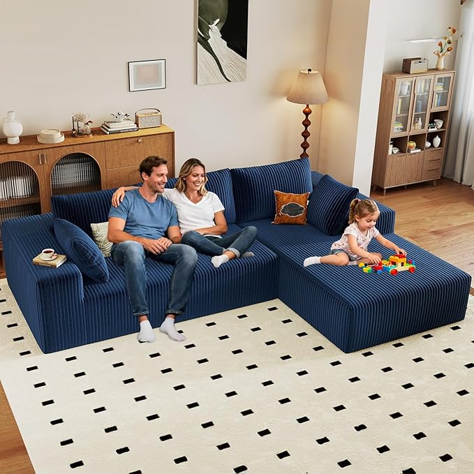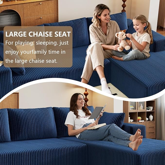 96" Modular Sectional Couch, Boneless L Shaped Cloud Sofa with Chaise Lounge, Corduroy Upholstered Couches Memory Foam Deep Seat, No Assembly Required, Ideal for Living Room(Blue, Right Facing)