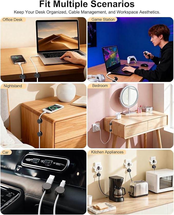 - MINIMALIST DESIGN SUIT FOR MULTIPLE SCENARIOS - Our minimalist design magnetic cable clips have a compact size(0.81"×0.81"×0.65") to fit multiple scenarios like office, home, bedroom, kitchen, desk, nightstand, game station, car, etc. Say goodbye to messy cords, keep your desk organized, cable management, and workspace aesthetics.