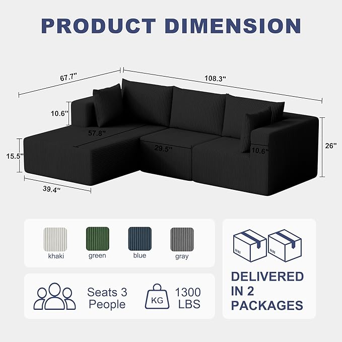 108" Boneless Couches for Living Room, Modular Cloud Couch Sofa - L Shap Corduroy Sectional Sofa, Fluffy Memory Foam Sleeper Sofa Furniture, No Assembly, Wide Armrest, Black