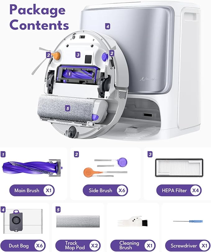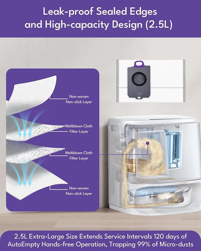 - [Large-Capacity Dust Bag & Efficient Filtration System] This comprehensive kit includes a genuine 2.5L large-capacity dust bag designed for Narwal Flow's station. The integrated high-efficiency filter works in concert with the station's optimized, wider and straighter dust collection pathway to help ensure smooth and thorough dust removal during the auto-emptying process