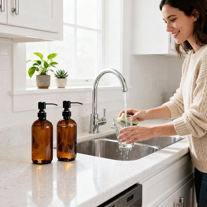 16 Oz Amber Glass Soap Dispenser with Black Pump, Refillable Liquid Hand soap Dispenser for Bathroom, 2 Pack Premium Kitchen Soap Dispenser