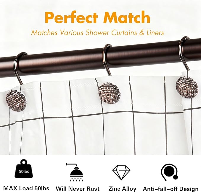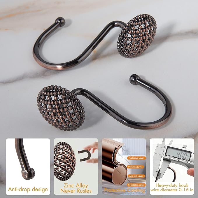 - Rustproof & Sturdier Zinc Alloy - Zinc alloy outperforms stainless steel shower hooks in rust resistance and durability. Bronze-plated finish complements most shower curtain rod colors and styles.