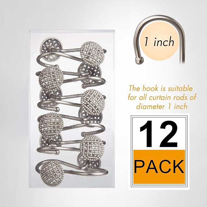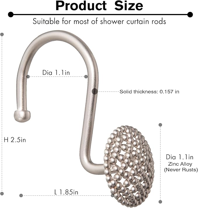 - Elegant & Stylish Design - These shower curtain hooks feature a charming round shape adorned with intricate bead detailing, adding a touch of elegance and sophistication to your bathroom decor. The combination of the metallic finish and the beaded design effortlessly complements various bathroom styles, from modern to classic.