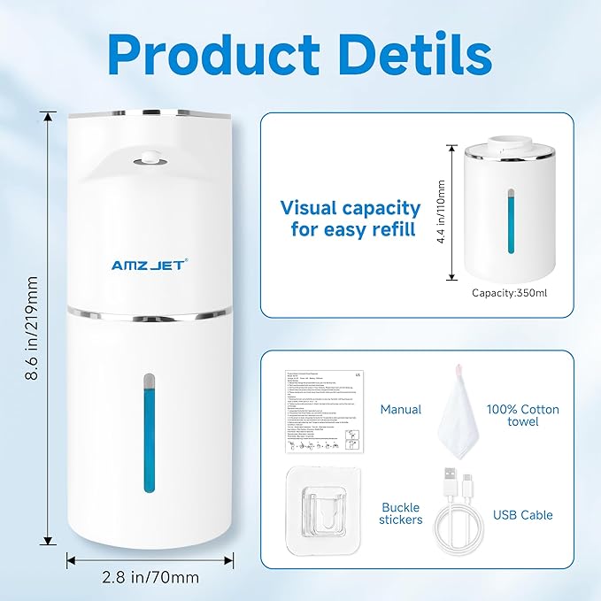- 【Type-C Rechargeable & Long-Lasting Power】This hand soap dispenser features a built-in 1200mAh rechargeable battery that fully charges in just 3 hours via Type-C cable and provides up to 800+ uses per charge. A smart choice for your soap dispenser bathroom setup