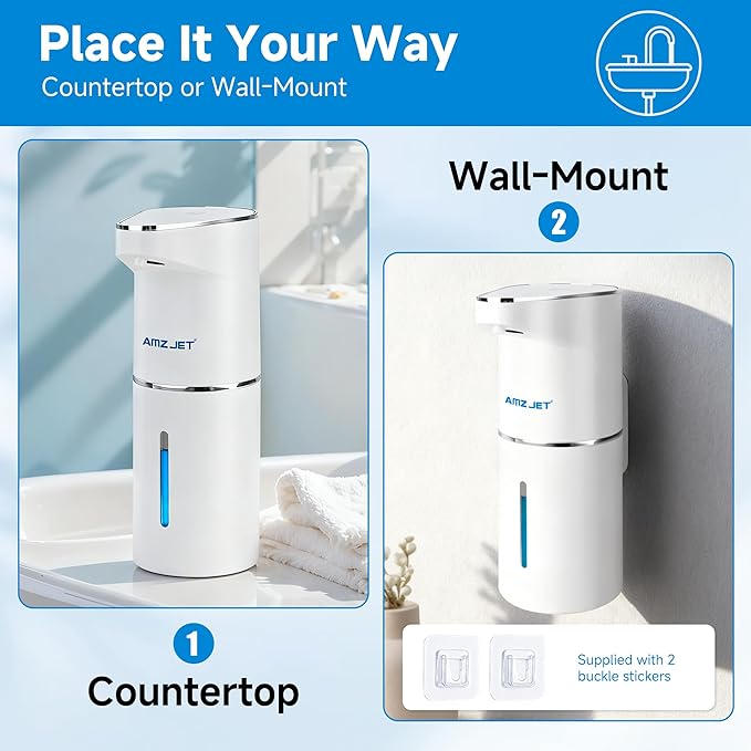 - 【2-Pack for Multi-Room Use & Flexible Placement】Comes with two automatic soap dispensers — perfect for both kitchen and bathroom. Supports wall-mounted and countertop placement, adapting easily to any home style. Works with various liquids including hand soap, dish soap, shower gel, or facial cleanser (recommended dilution 1:6)