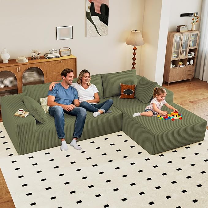 96" Modular Sectional Couch, Boneless L Shaped Cloud Sofa with Chaise Lounge, Corduroy Upholstered Couches Memory Foam Deep Seat, No Assembly Required, Ideal for Living Room(Green, Right Facing)