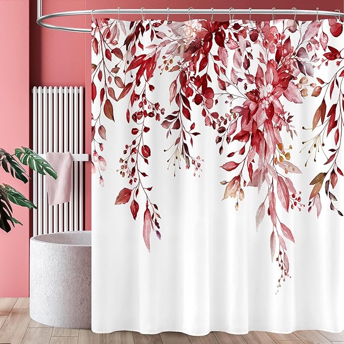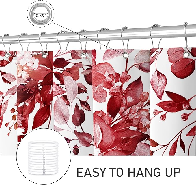 Extra Long Eucalyptus Shower Curtain 72 x 96 Inch, Burgundy Red Botanical Floor to Ceiling X-Long Shower Curtain, Watercolor Plant Leaves with Floral Decorative Bathroom Curtain with Hooks