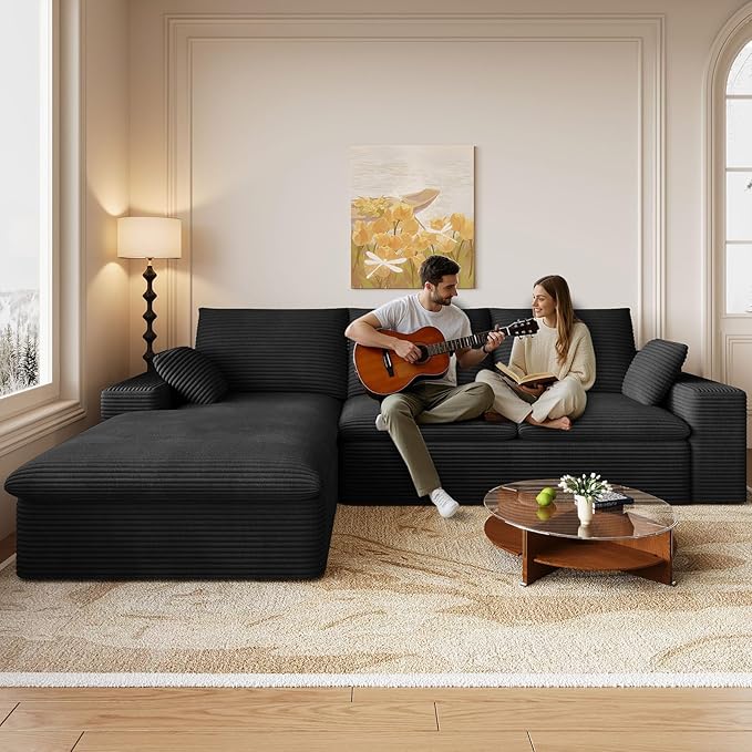 107 Inch Cloud Sectional Couch, Modern Modular Sectional Sofa with Deep Seat, Corduroy Boneless Couches with L-Shape Chaise for Living Room Bedroom, No Assembly Required (Black, Left Facing Chaise)